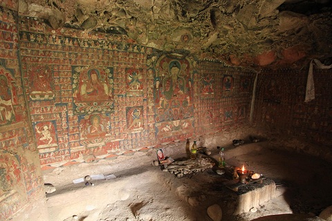 サスポル村の北側の崖に開かれた石窟ゴンパ。たくさんあるなかの数窟に壁画が残されており、下写真は最も壁画が美しく残っている洞窟のもの。訪れるには崖を少し登っていかねばならないが、その先には登るだけの価値がある壁画が待っている。フラッシュを使わなければ写真撮影可能。